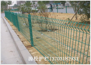 第四種綠色圈地圍欄網是折彎網片護欄網、三道灣、二道灣都可以根據所需高度折彎、配用桃形立柱、外表華麗大方、結實耐用、一般在開發區、景區、港口碼頭、車站、小區等可見、顏色除綠色外還有藍色、白色、紅色、黃色、也可以搭配不同顏色立柱、紅白、白藍、白綠等。